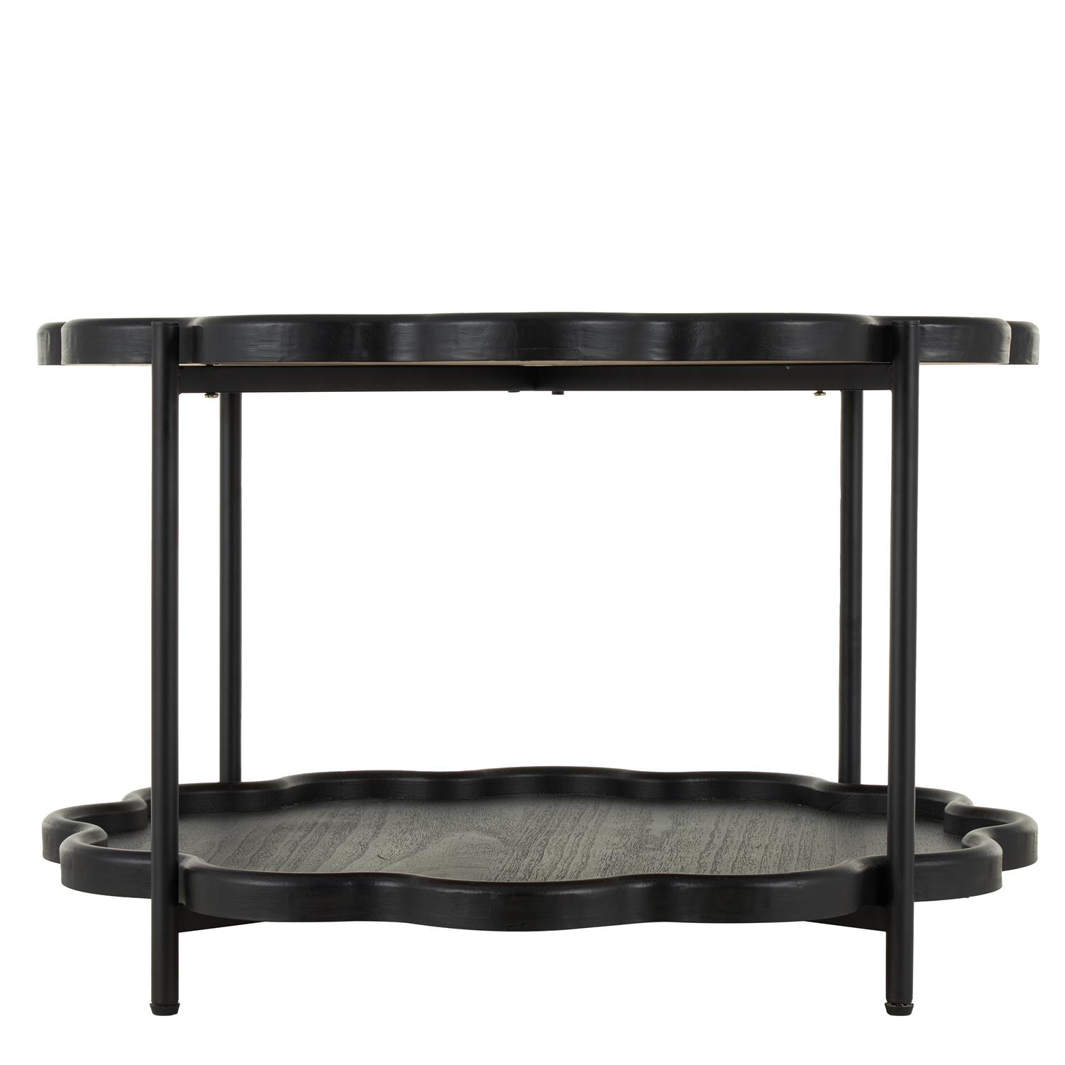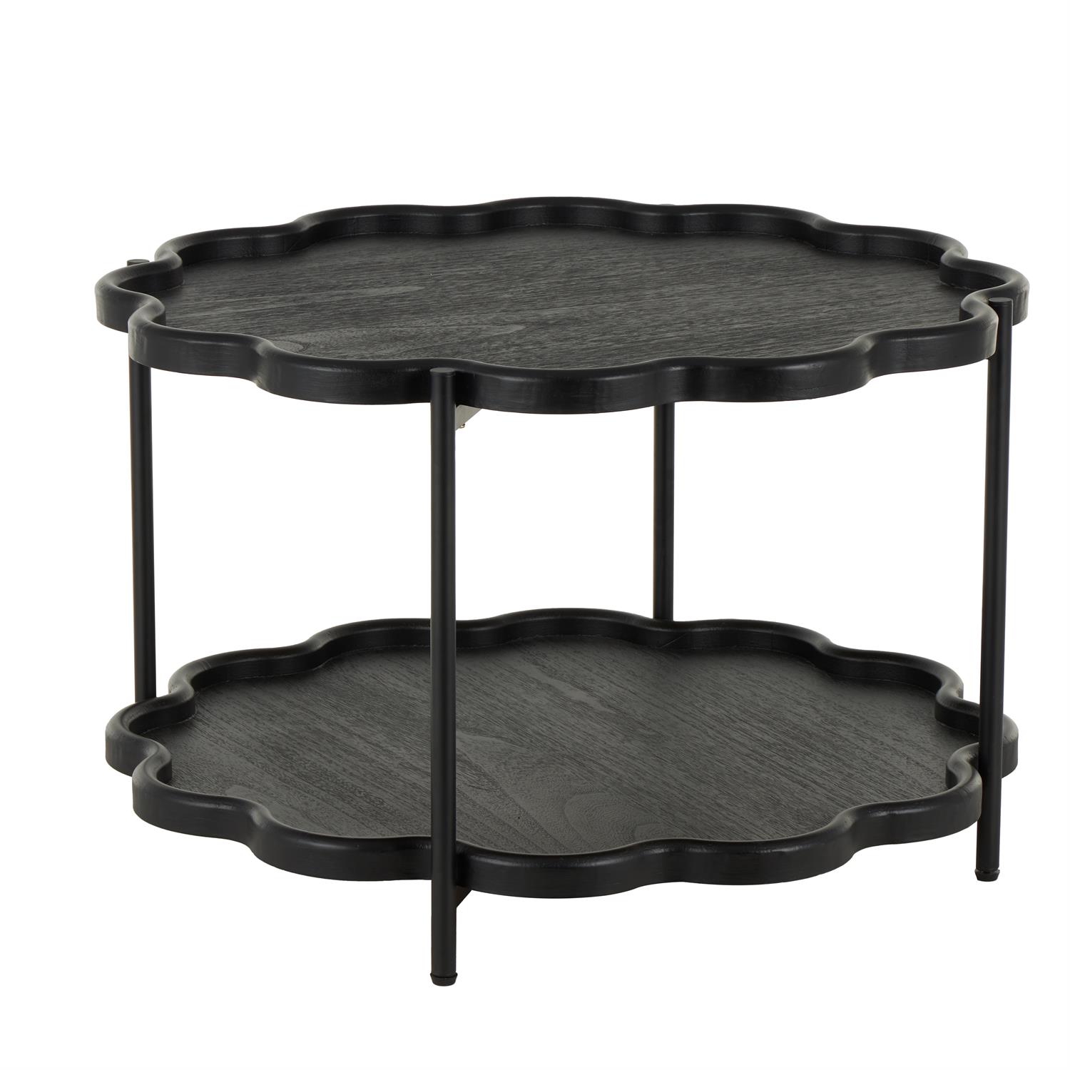 This wood coffee table features two levels and a floral-inspired design that makes this a standout piece. The black wood coffee table measures 31.5L x 31.5W x 20H inches, and weighs 21 lbs. This varnished black center table for living room has a stylish floral inspired round shape, adding elegance to any décor. Wipe clean with a dry cloth.