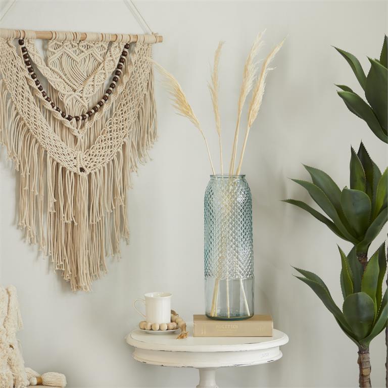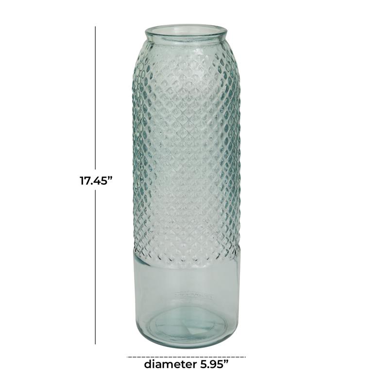 - Textured glass vase features a tall cylinder body with a fishnet inspired exterior and a round mouth opening
