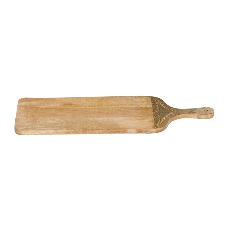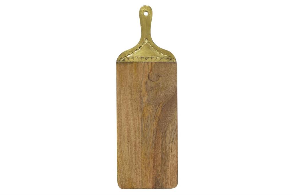 Elevate your space and add a touch of luxury with this glam inspired piece. Crafted with mango wood board and brass handle. Natural brown finish on the wood and eye-catching gold accent detail on the handle highlight this cutting board. An elegant cut and complemented with natural and gilded patterns give this kitchen decor a chic design.