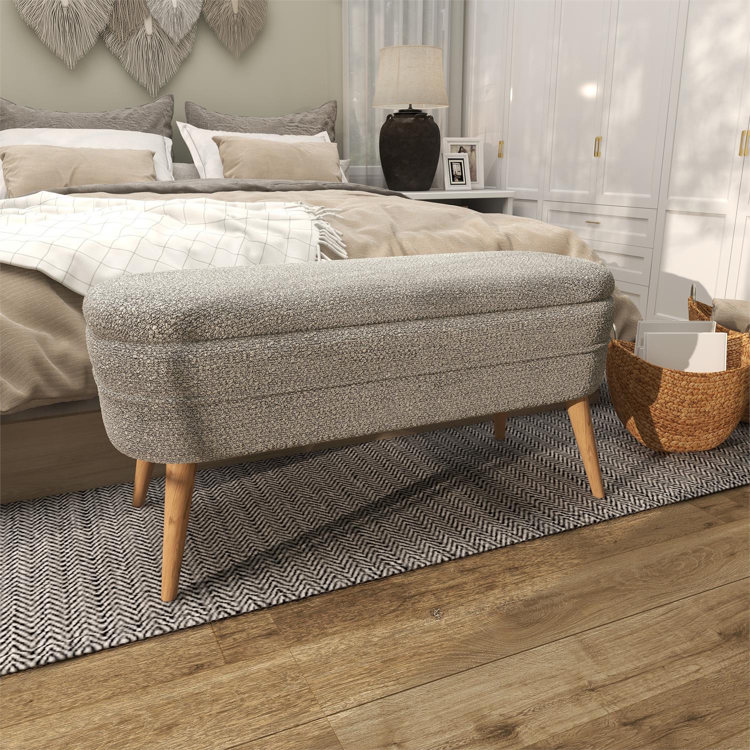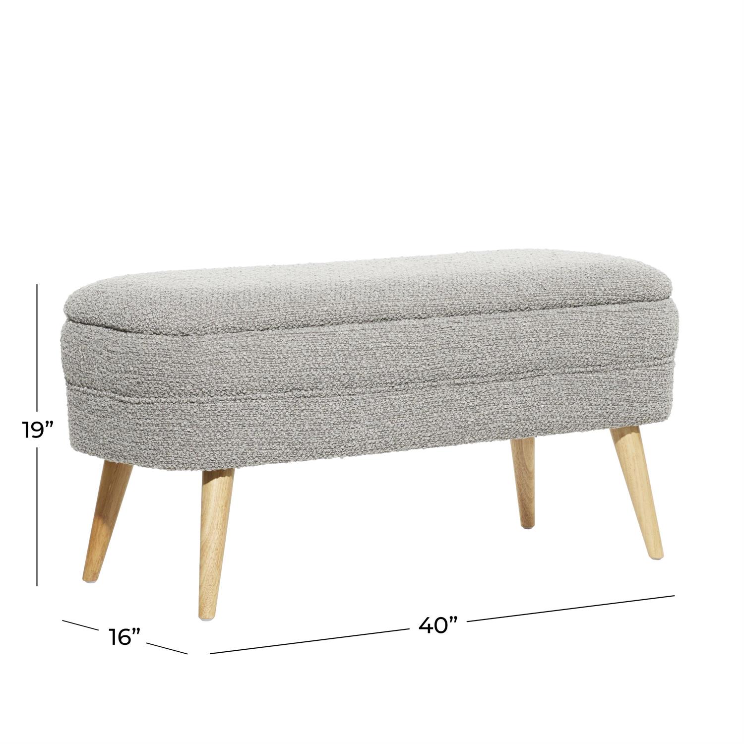 Gray Polyester Rounded Upholstered Boucle Room Storage Bench with Tapered Wood Legs