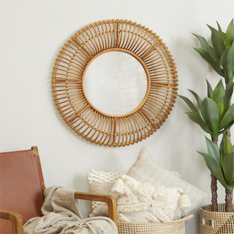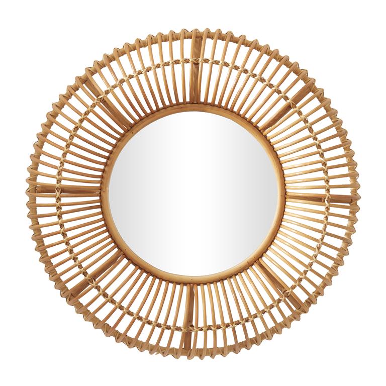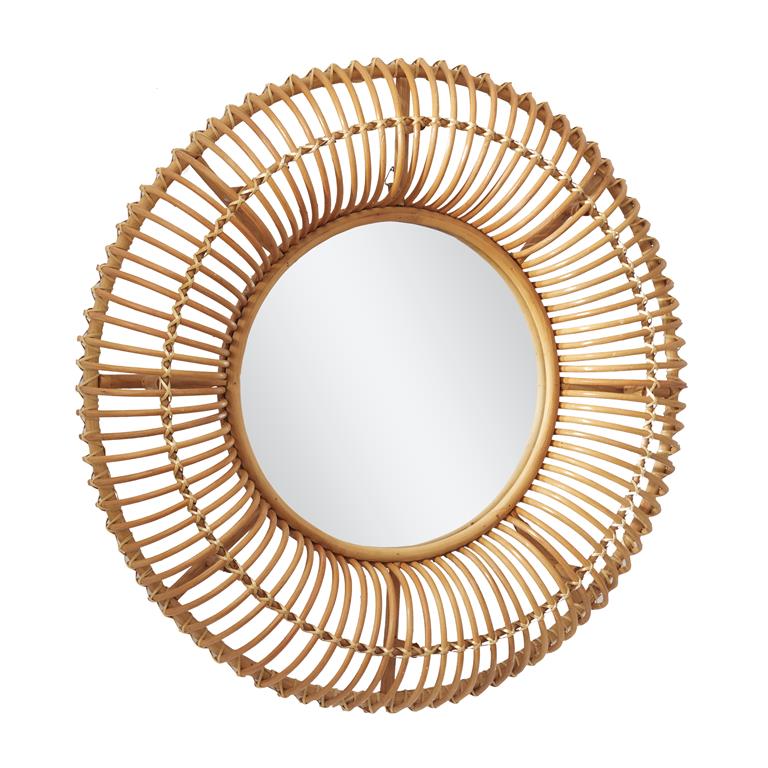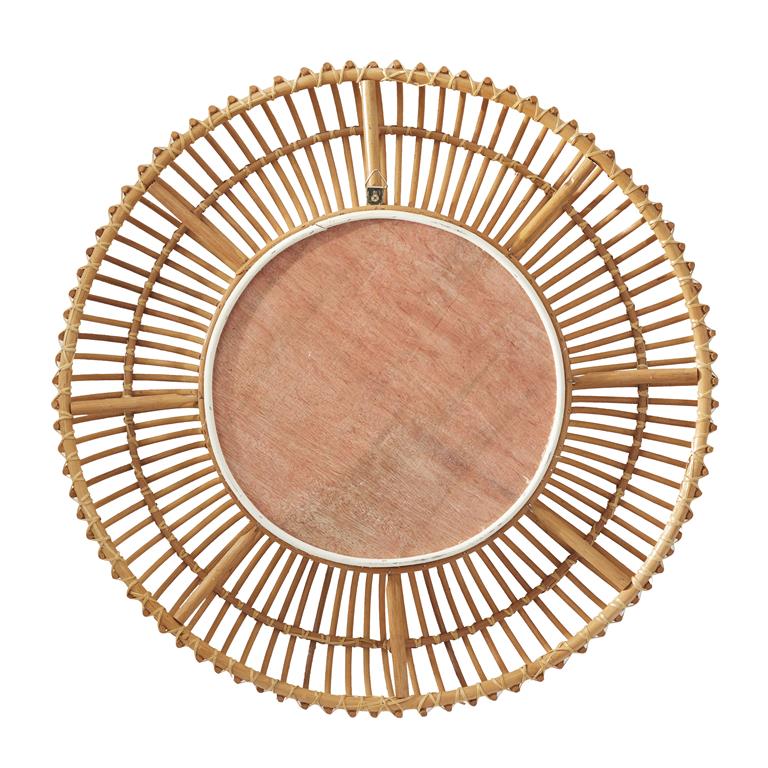 Accentuates a round frame in arched grid patterns for a projected look^Wipe clean with a dry cloth^Mirror is encased with a combination of rattan and palm tree frame and backing hardware