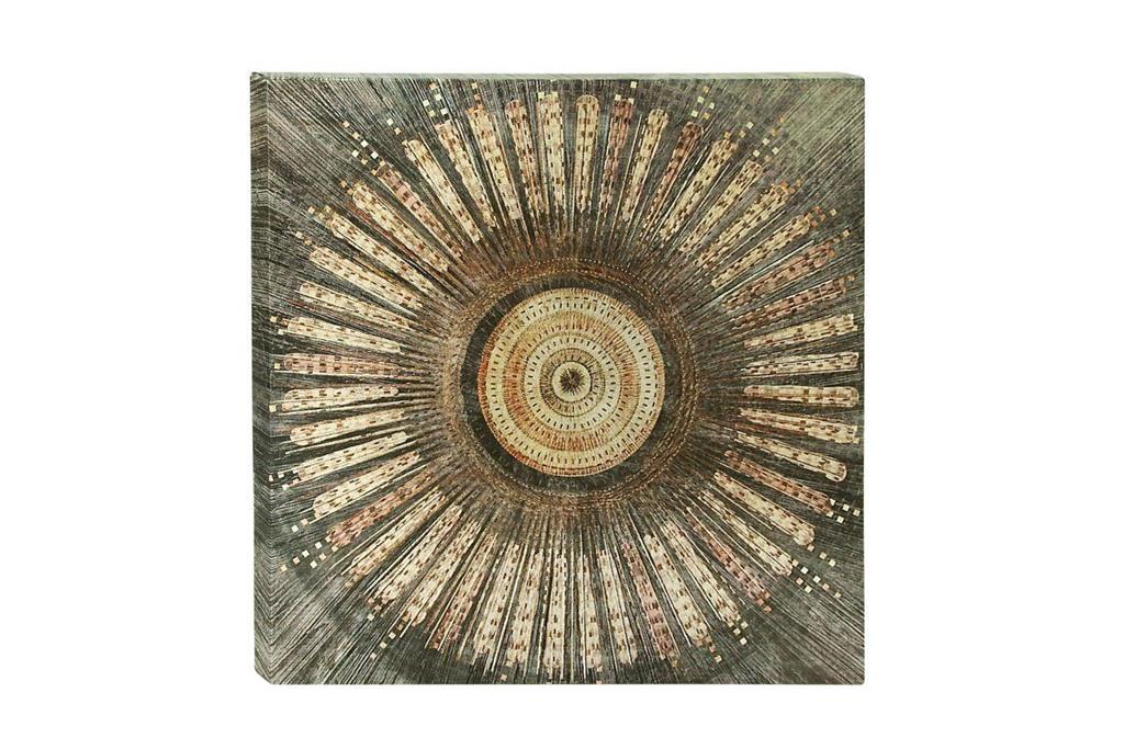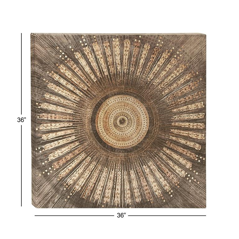 36” x 36″ Canvas Arts canvas metal art print, features canvas and aluminum art wrapped around a square pine wood frame, displays a radial pattern art using beige, yellow, black and light orange colors