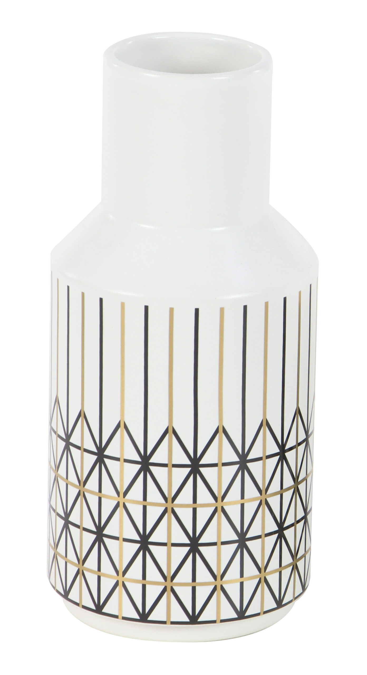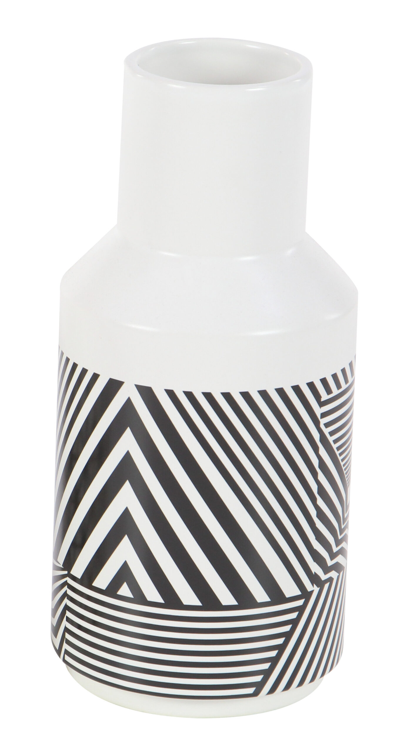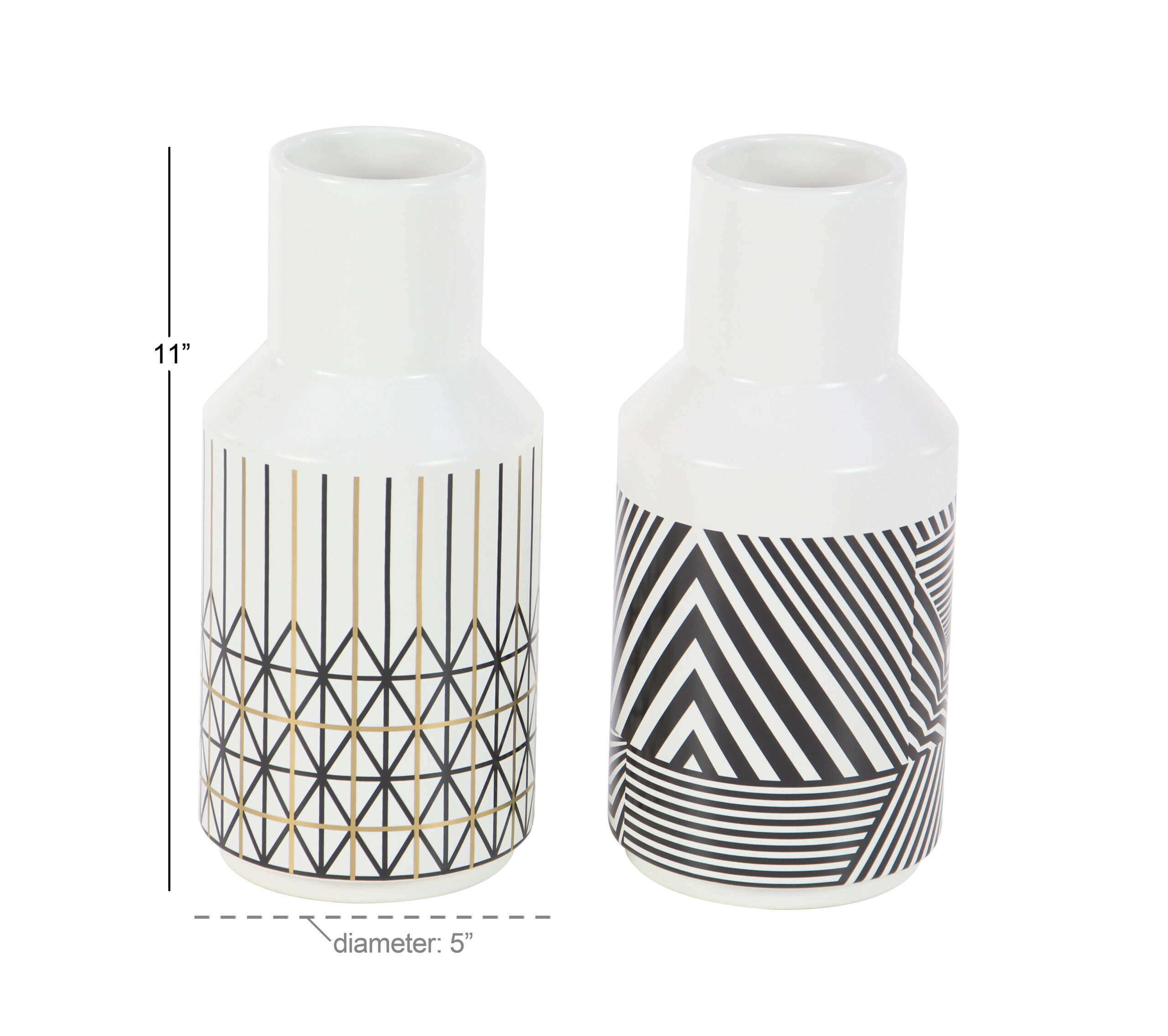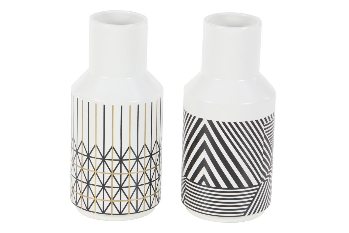 This modern ceramic vase have symmetrical, cylindrical silhouette, each white vase is decorated to compliment the other. An opaque, semi-glossy white undercoat makes these patterns pop. Use to display foliage, twigs, or simply let these stylishly fly solo.