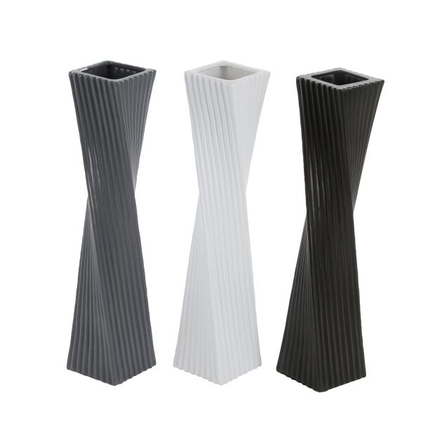 Stark, bold, and modern, these vases are an artful addition to any space. The twisted rectangle bodies deliver a whimsical touch for a distinctive accent or way to display flowers. Made of earthenware. Glazed finish. Twisted rectangular bodies. Vertical ribbed patterns.Grey, white, and black colors.