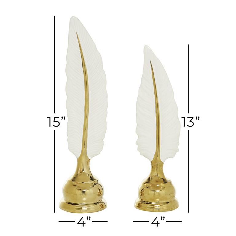 This set of 2 gold and white ceramic feathers is ideal for any flat surface in need of décor leveling up. Suitable for practically any type of décor style you choose, these feather sculptures are charming additions to bookshelves, tables, or desks. Pair together on a shelf, or by themselves as a statement piece. This set of two measures 13″ and 15″ in height. Display together or separately in the living room, study, home office, or bedroom on top of a dark brown wood surface. Designed with black rubber stoppers at the base that prevent scratching furniture and table tops, as well as sliding around.