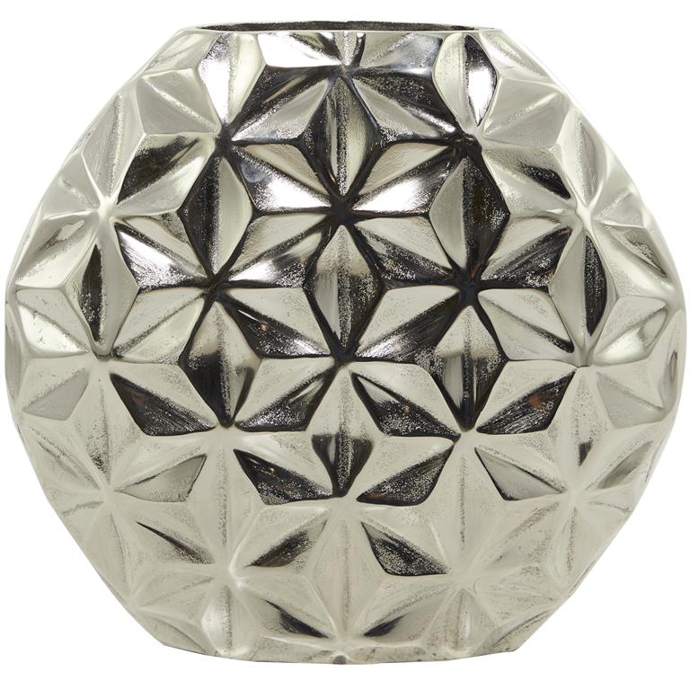 The faceted surface in a geometric patterns add dimension to this round flat vase underscored by its metallic silver finish for a chic and elegant table top decor