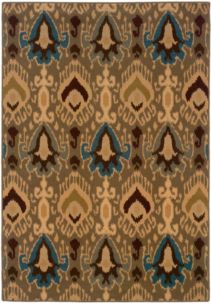 This machine made Sphinx by Oriental Weavers rug was made from a Wool Blend. This traditional style area rug features an ikat design with brown, teal, black, blue, ivory, green and beige colors.