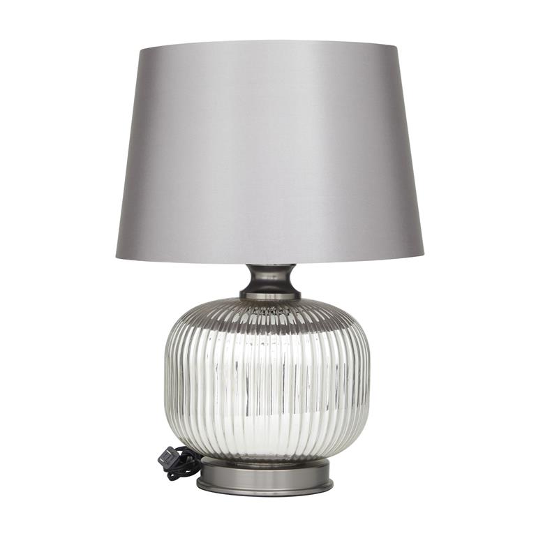 - Decorative table lamp with a gray shade and base as well as a silver body