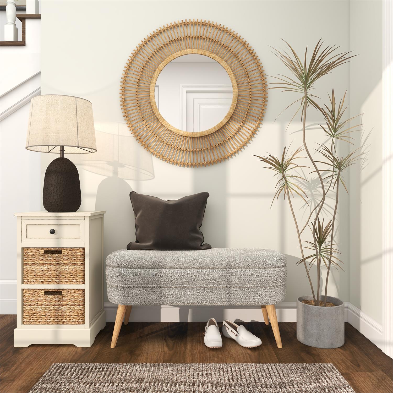 - Splayed wooden feet are securely attached to the compartment and upholstered polyester fabric making this contemporary entryway storage bench
