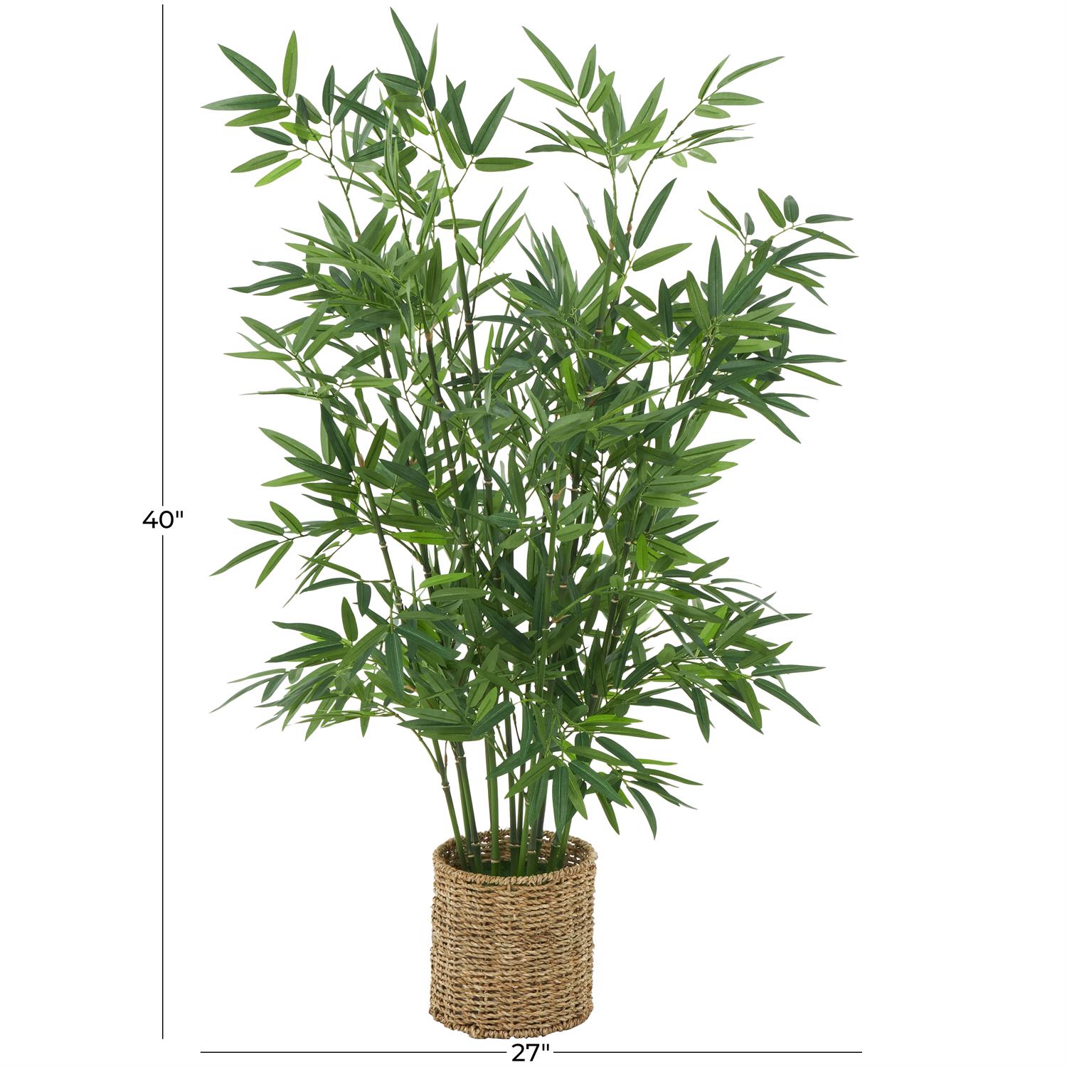 Natural realistic artificial tree is crafted with shaped plastic for the stems and polyester for the leaves, placed on a woven pot made of seagrass.