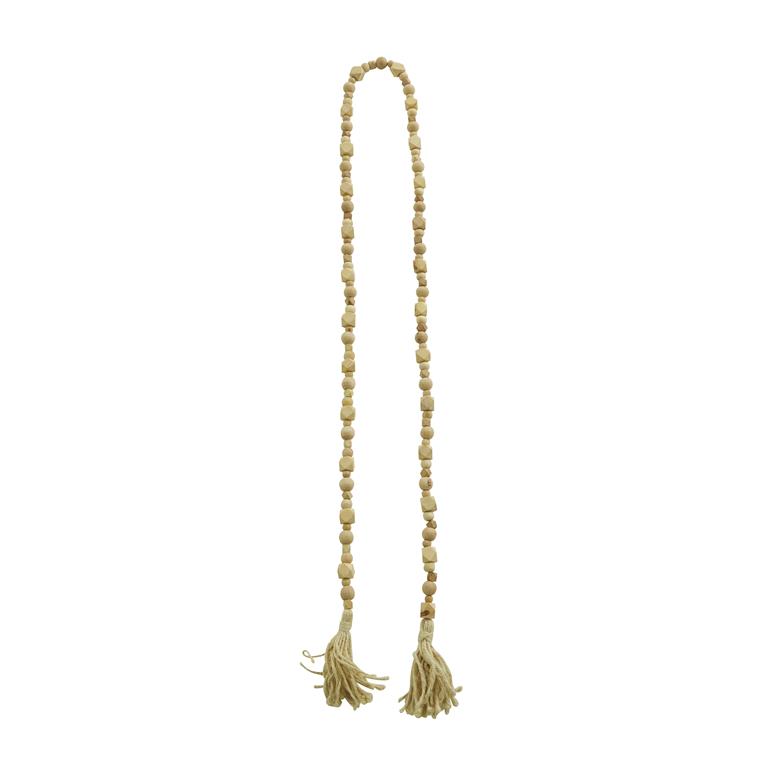 A beaded garland decoration with light brown beads and cream cotton tassels.