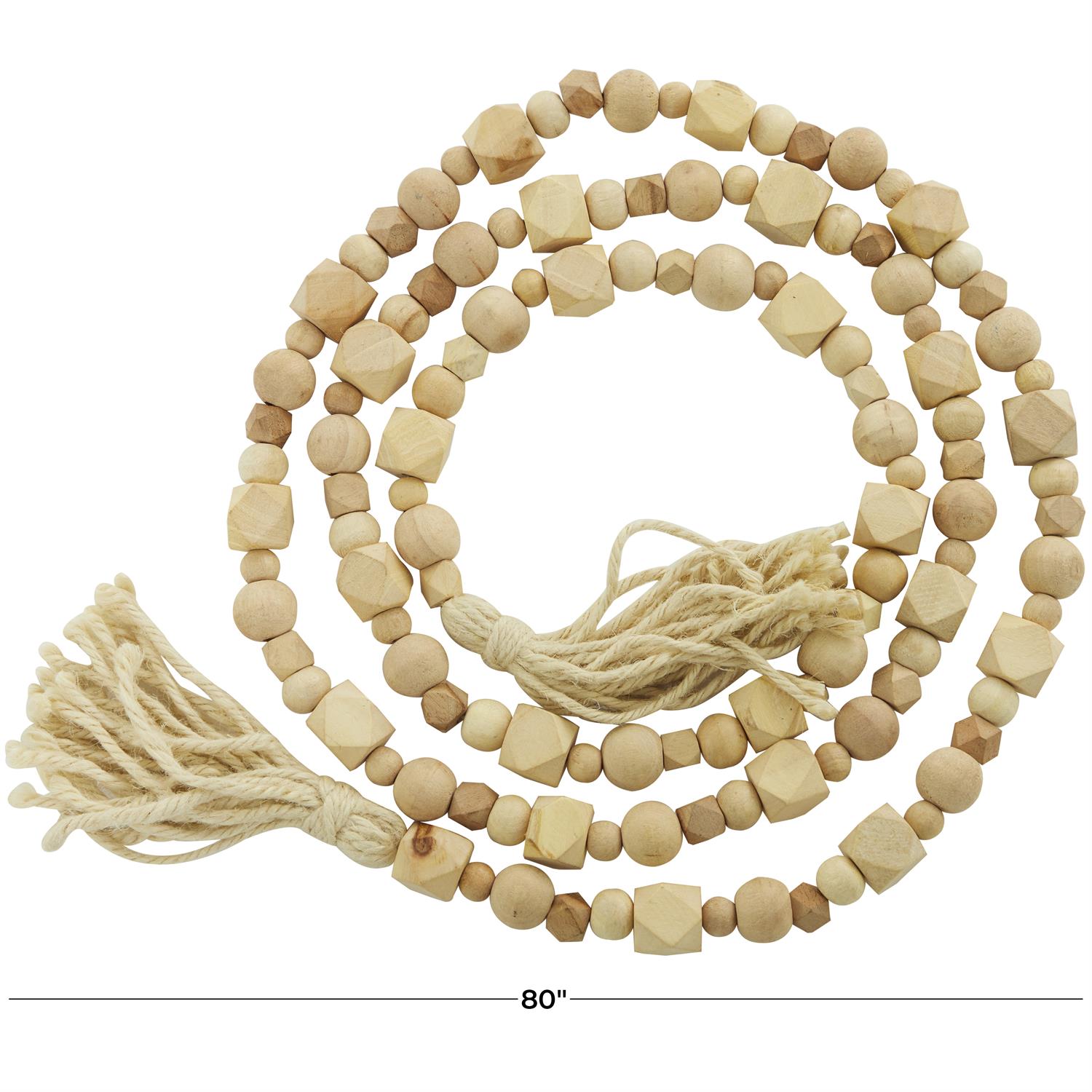 Natural wood and jute garland features a simple and versatile design that showcases faceted beads and end tassels tied in a fringe style for playful touch.