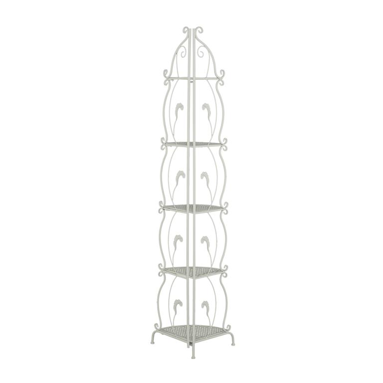 - This tall outdoor bakers rack features a triangular 5 tier shelving unit designed with scrolled and flourish inspired body frames