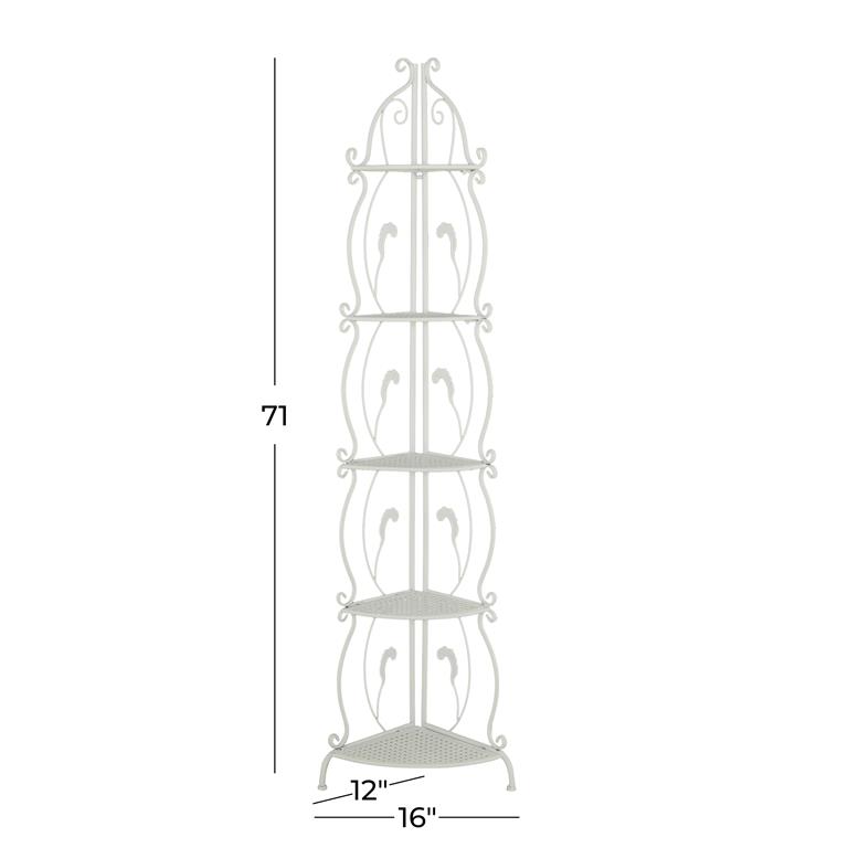 This tall bakers rack for plants showcases a towering 5-tier corner shelf unit with a triangular mesh iron base and charming flourish and scrolled body frames