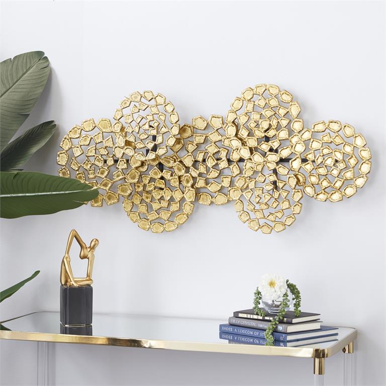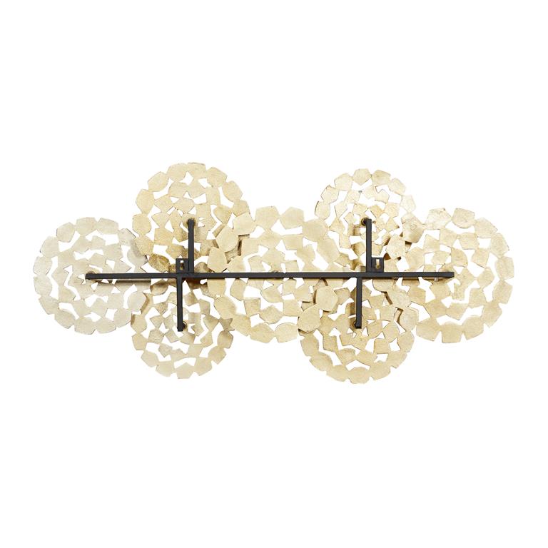 • This wall décor features small metal gold nuggets fused on their corners and edges to form a circular pattern