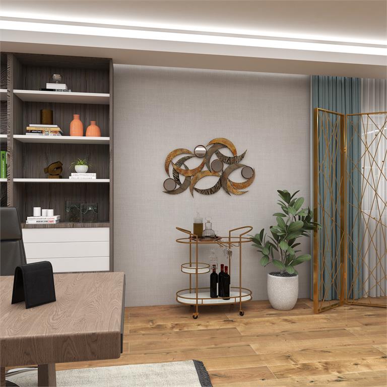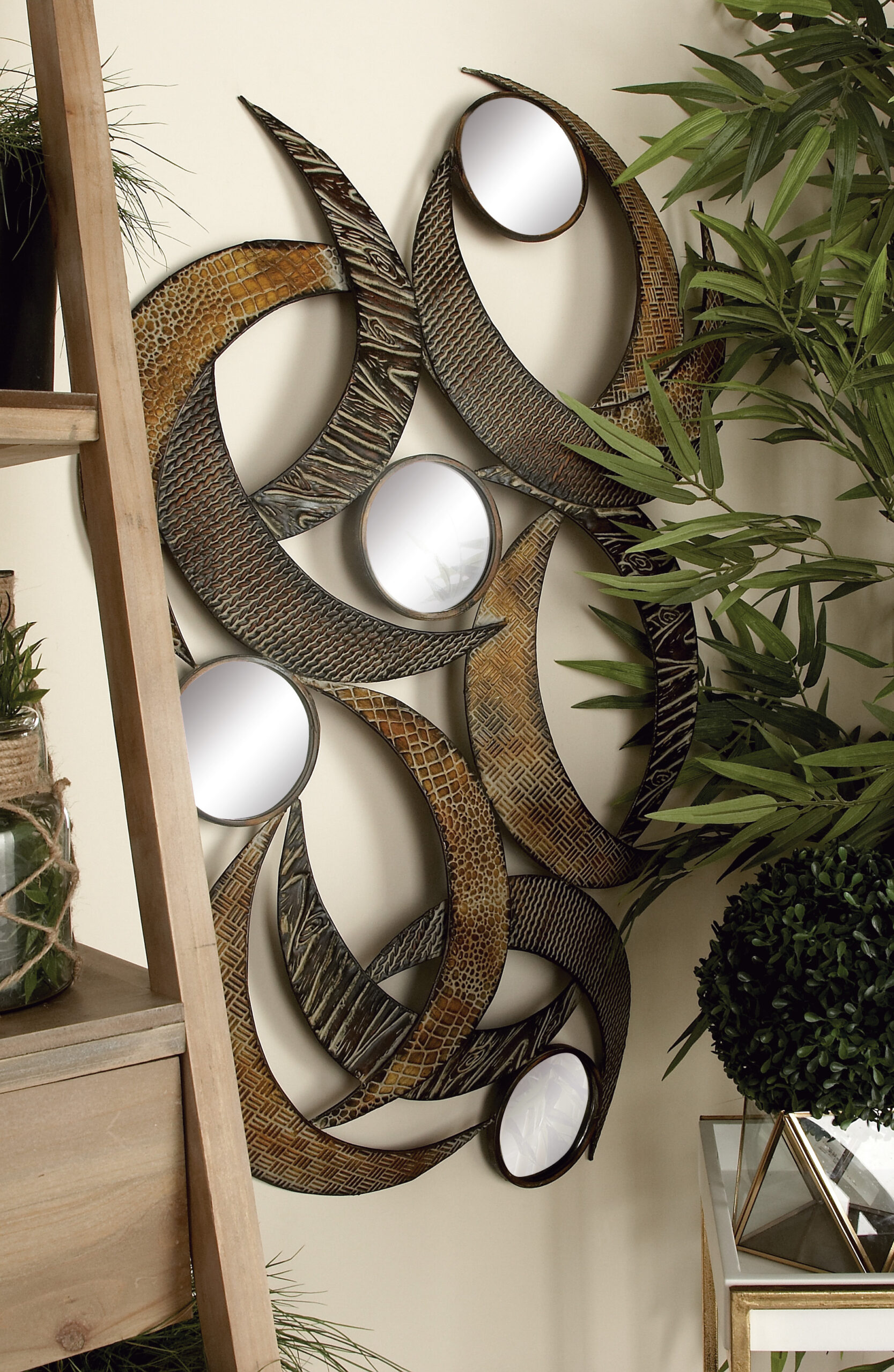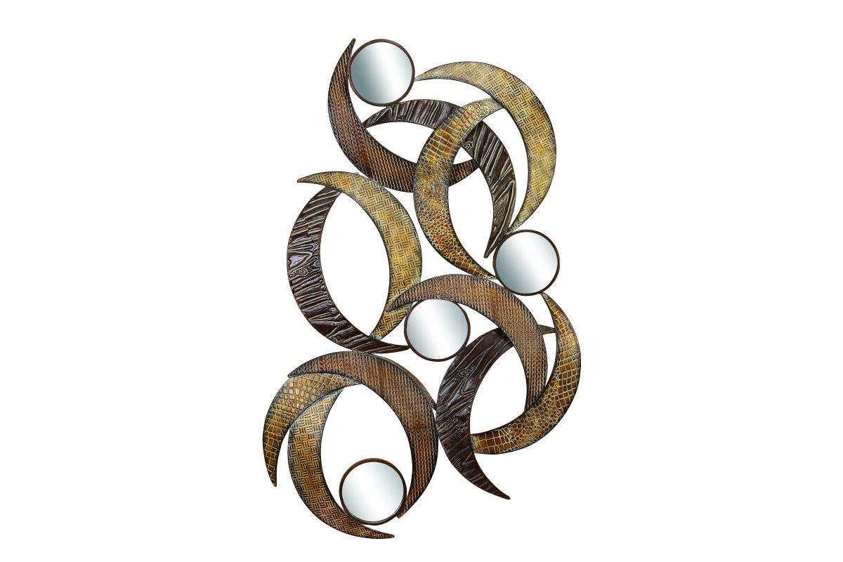 Metal and mirror construction. Antique brown and white finish. Circular shaped wall mirrors. Intricate patterns on crescent shaped structures. An abstract mirrored accent, the Benzara Metal Wall Mirror provides wonderful color and electric energy to any contemporary design scheme. Twelve crescent-shaped metal panels are combined together along with four round mirrors to create this piece. Each crescent comes with a unique texture and brown finish that create a dense, layered look.