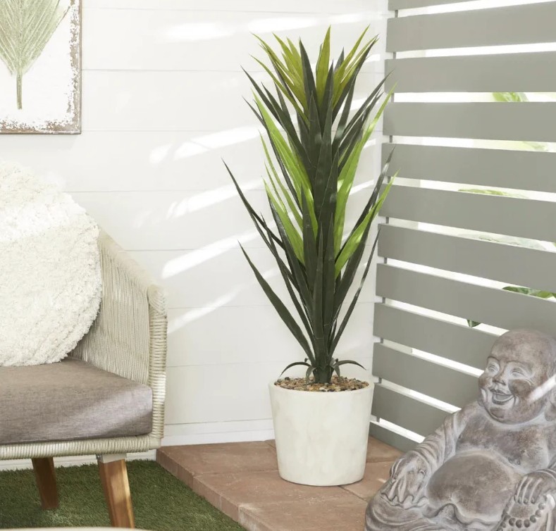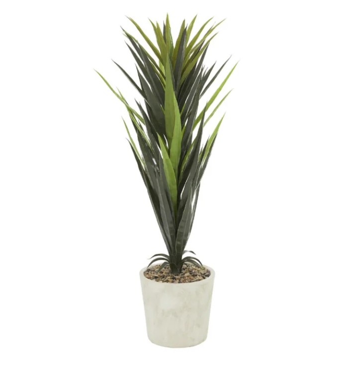 Embrace artistic expression with a design that emphasizes bold shapes, sleek lines, and a minimalist aesthetic, bringing effortless beauty to your space. This green indoor-outdoor artificial plant is expertly crafted from durable polyethylene material, ensuring both a realistic appearance and long-lasting quality. The round artificial greenery features a vibrant mix of green and yellow-green leaves, complemented by black and brown stones in a matte beige pot for a modern, understated look. The striking faux foliage showcases tall, spiky leaves, with natural stone fillers nestled in a large ceramic pot, adding a touch of nature’s beauty without the upkeep.