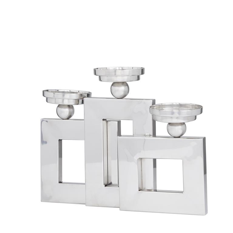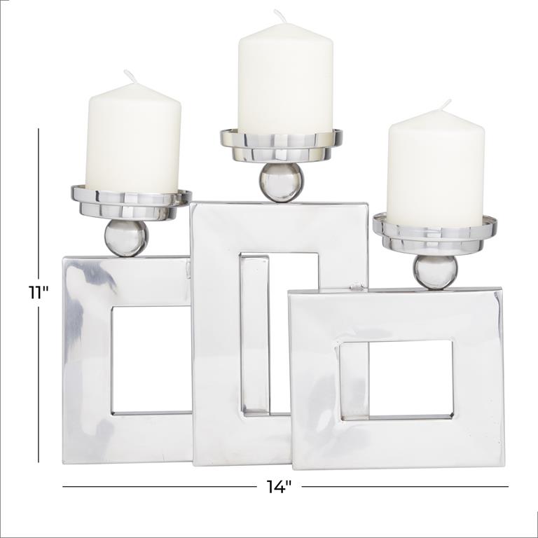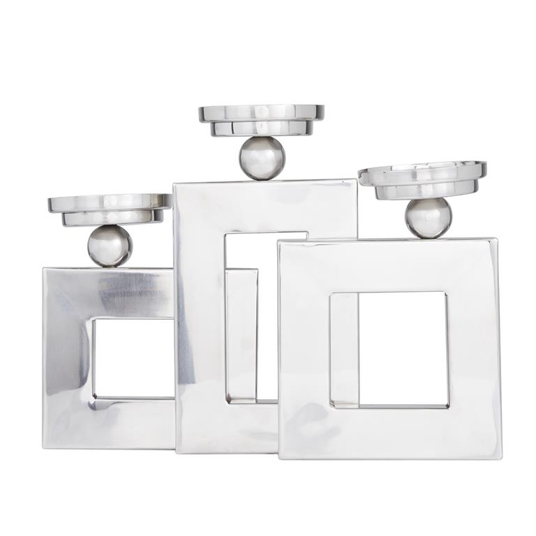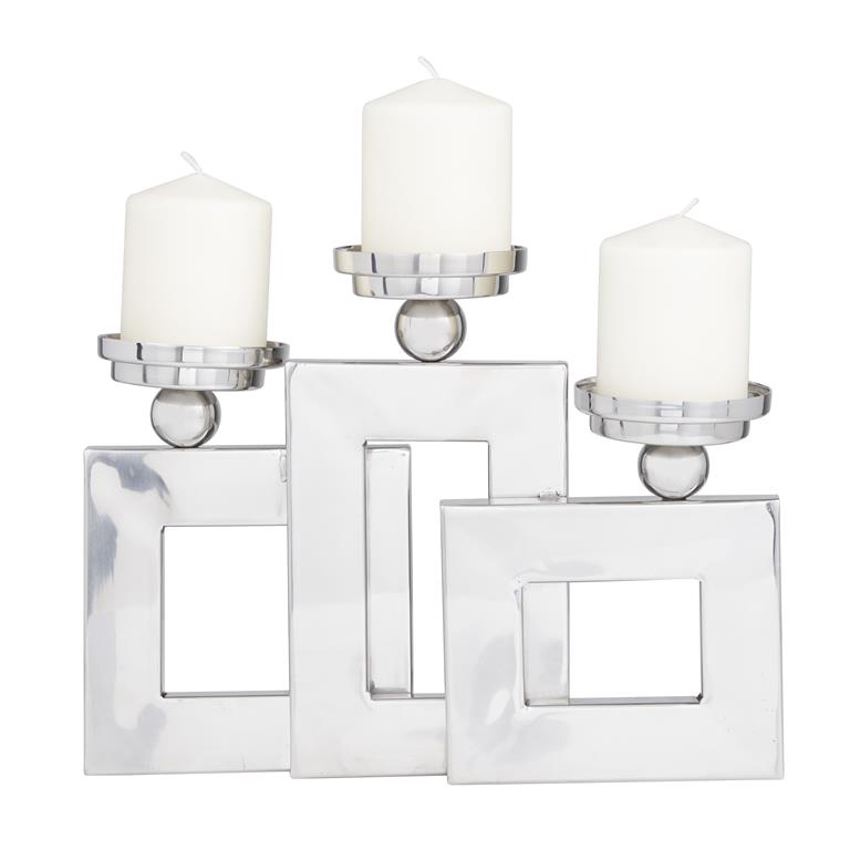 - A set of modern silver candle holders featuring round candle plates with ball accent stands and rectangular bodies in varying sizes with an open design