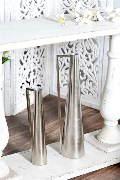 These iron slim pitcher vases with silver finish create that chic and refined vibe for eclectic-themed home spaces. Made with iron, these vases highlight an inverted cone structure with single handles and a sleek finish. Placed on your console or coffee table, these polished vases are elegant accents or centerpieces for any of your glam contemporary home themes.