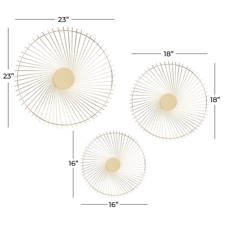 Each item measures 22.63″ x 22.63″ x 2.50″, 18.00″ x 18.00″ x 2.88″, and 15.50″ x 15.50″ x 2.50″; and collectively weights 2.70 lbs. Suitable for indoor use only. Each set comes with 3 different sized round wall Décor. Easy to hang with nail or screw via loop hardware on the back. Contemporary theme. Made in India.
