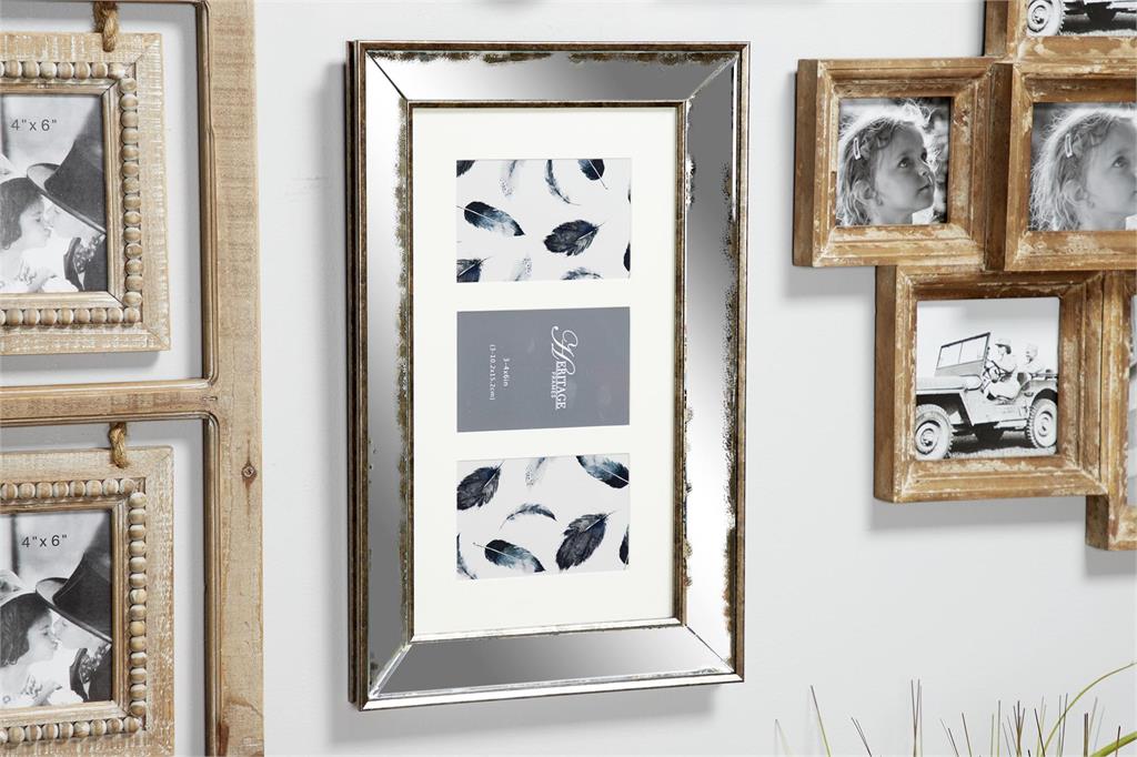 Textural and rich with antique charm, this large, rectangular collage picture frame makes for beautiful antique décor. Display three 4 x 6” photos or small art prints vertically or horizontally within the distressed and textured copper and silver mirrored frame with a white mat board. From the brushed copper-colored metal with the decoratively eroded angled mirror sections, this vintage picture frame will pull together any room with vintage style while acclimating seamlessly to any color scheme.