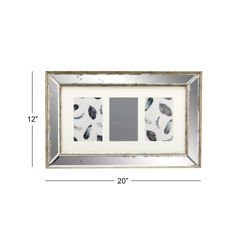 - Rectangular wall picture frame features silver glass with distressed finish