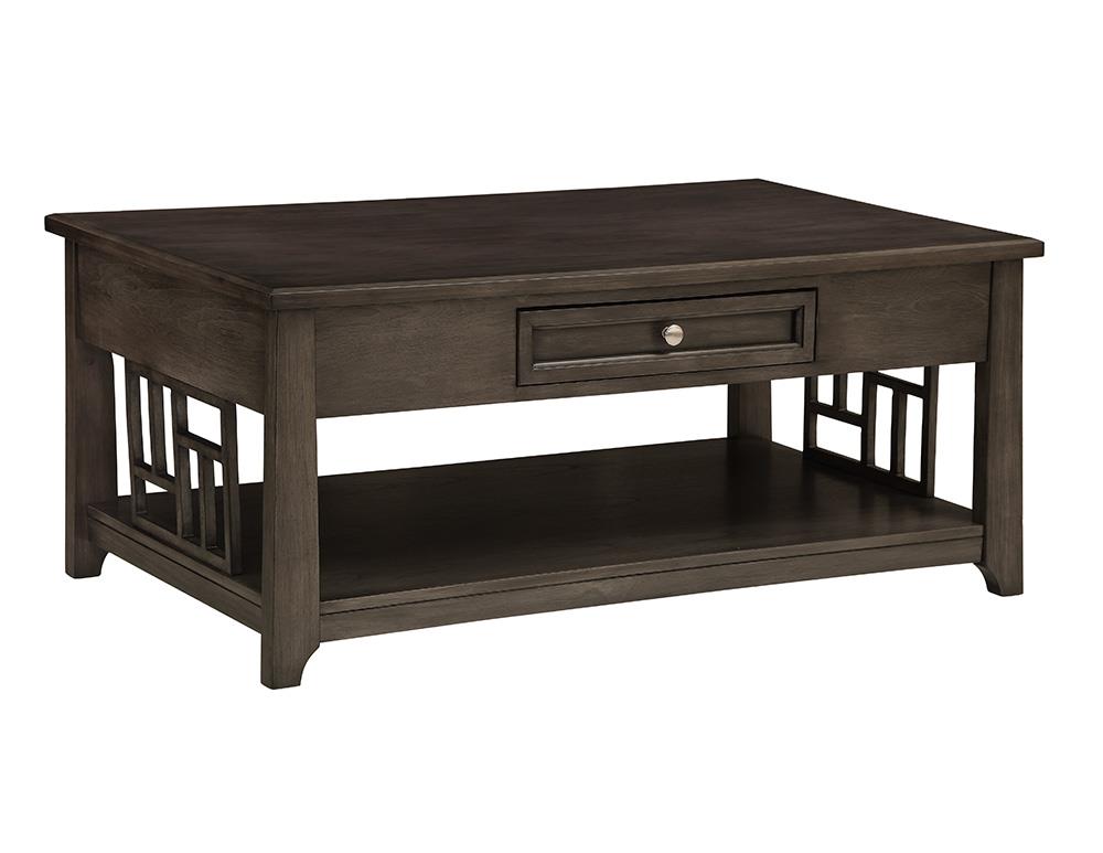 Transitional styling that features elements of American Craftsman. Tables have drawer storage and open fret work on sides and bottom shelves. Mindi veneers in a beautiful translucent grey finish. Cocktail has casters. Brushed nickel hardware.