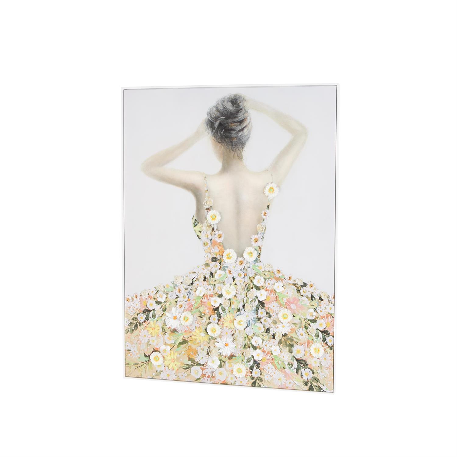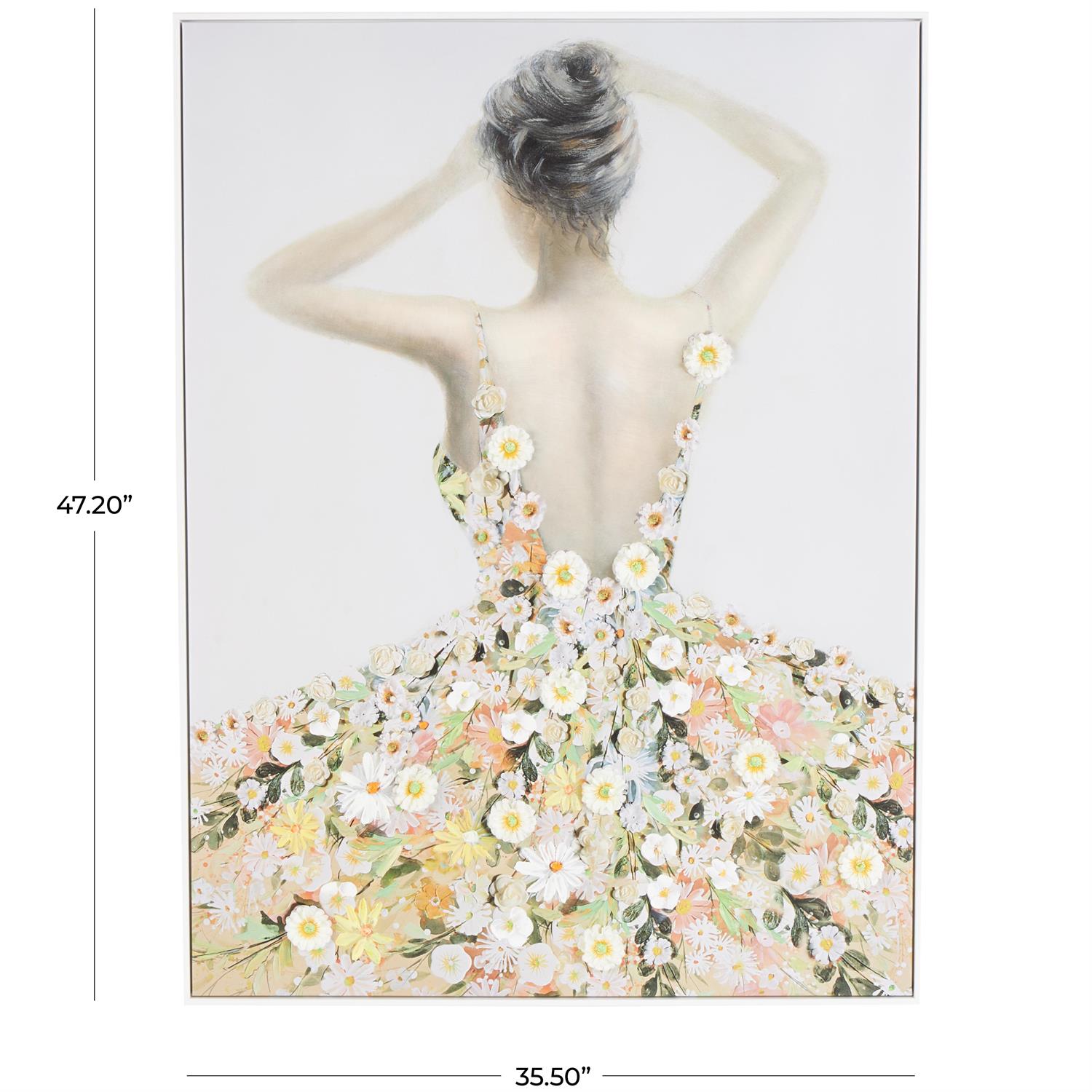 - The textured multicolored wall framed art has a rectangular canvas showcasing a woman with daisy patterns on her dress, making it suitable for various interior designs
