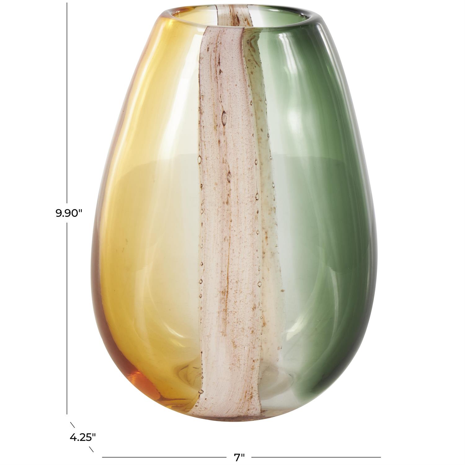 Designed with timeless sophistication, rich old-world textures and warm hues come together for a refined classic taste of luxury. The multi-colored decorative vase is crafted from both regular and recycled glass, ensuring that it is durable and eco-friendly. Round home decor vase features a tinted finish with a blend of colors that include orange on the left, green on the right with a pink and brown stripe in the middle. The unique feature of this glass vase is its textured stripe details, adding an extra touch of elegance and sophistication. The multicolored glass vase measures 7L x 4.25W x 9.9H inches, and weighs 3.775 lbs