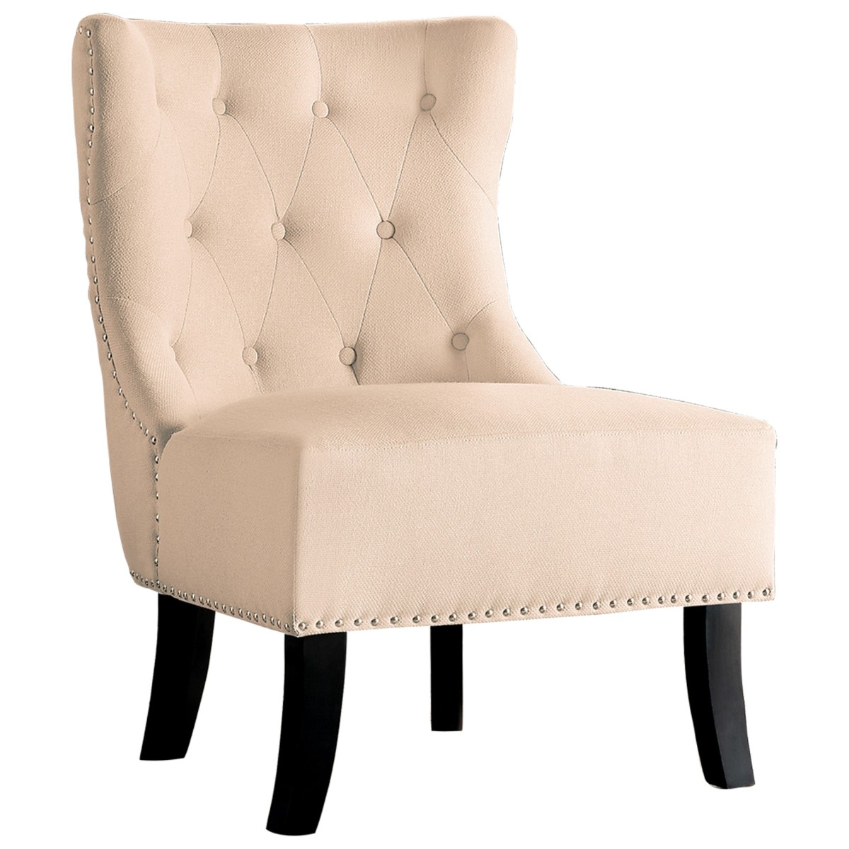 Solid wood and plywood frame. Foam padding over pocket coils. Fabric upholstery. Attached back and seat cushions. Exposed wood legs with brown finish. Button-tufted chair back. Nailhead trim. Assembly required. Weight capacity: 300lbs. Fabric Color: Beige. Fabric Content: 100 percent polyester.