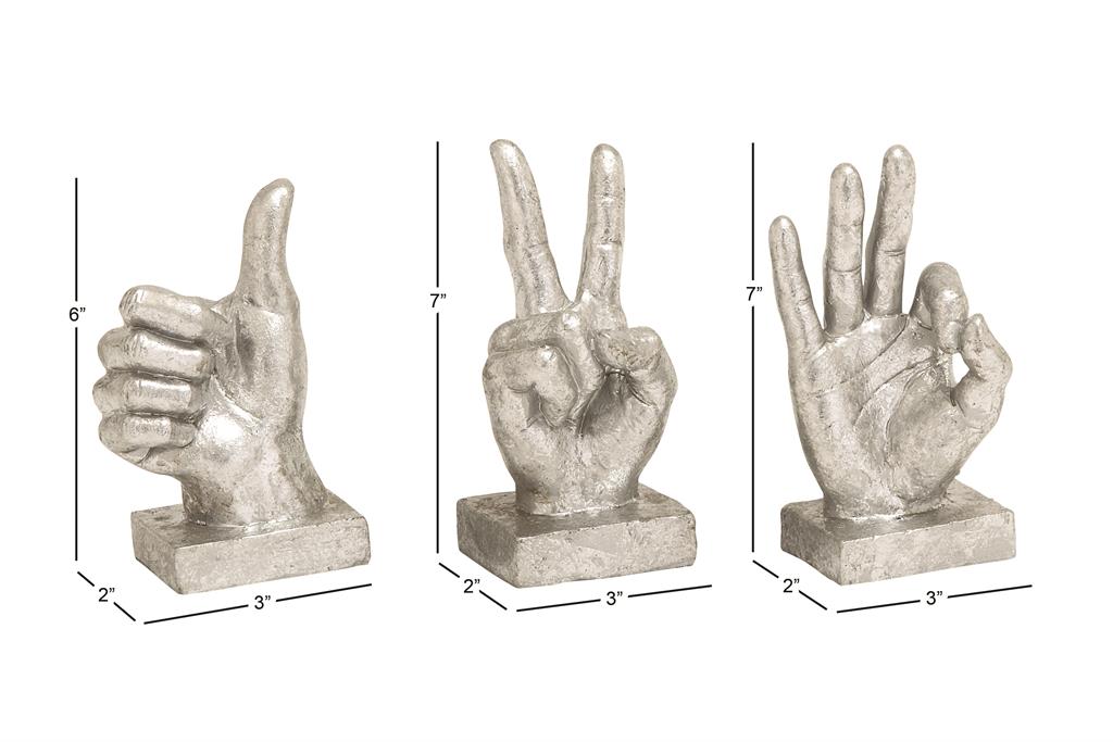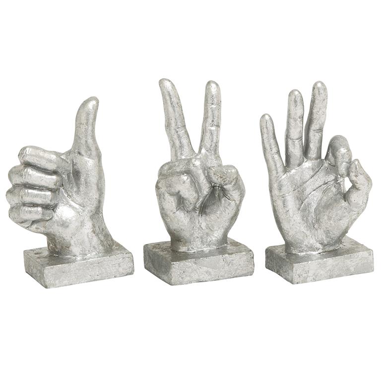 • Each hand sculpture gesturing a thumbs up, peace sign, and “OK” signs on a square base