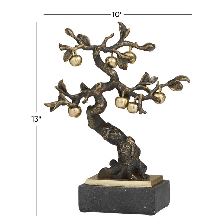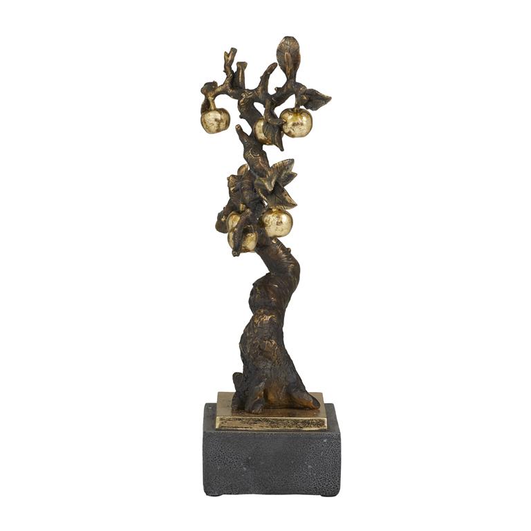 This tree sculpture with fruits highlights a bronze finish that enhances contrast and depth in any room