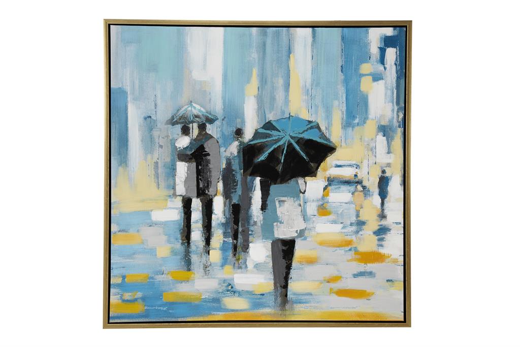 Full of movement and texture, this large blue and gold acrylic painting of people walking with umbrellas in the rain makes a dynamic addition to your contemporary décor. The textural, linear white, aqua, gold, and turquoise blue brush strokes form abstract vertical rainfall falling on the black, gray, and white figures beneath walking on the same colored horizontal lines at the base of the painting.