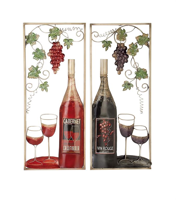 Red Metal Traditional Wine Bottles and Glasses Wall Decor, 2 Assorted