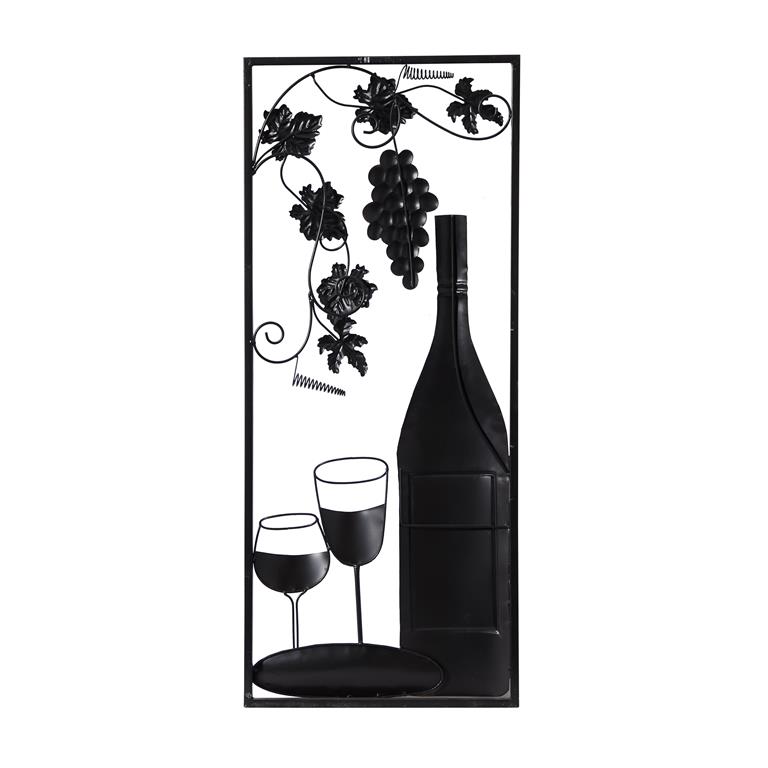 This wall decor features a standing rectangular frame with wine bottles, wine glasses, grapes, leaves, and vines^Wipe clean with a dry cloth^This traditional wall decor is shaped and welded from iron materials to form the lovely wall art