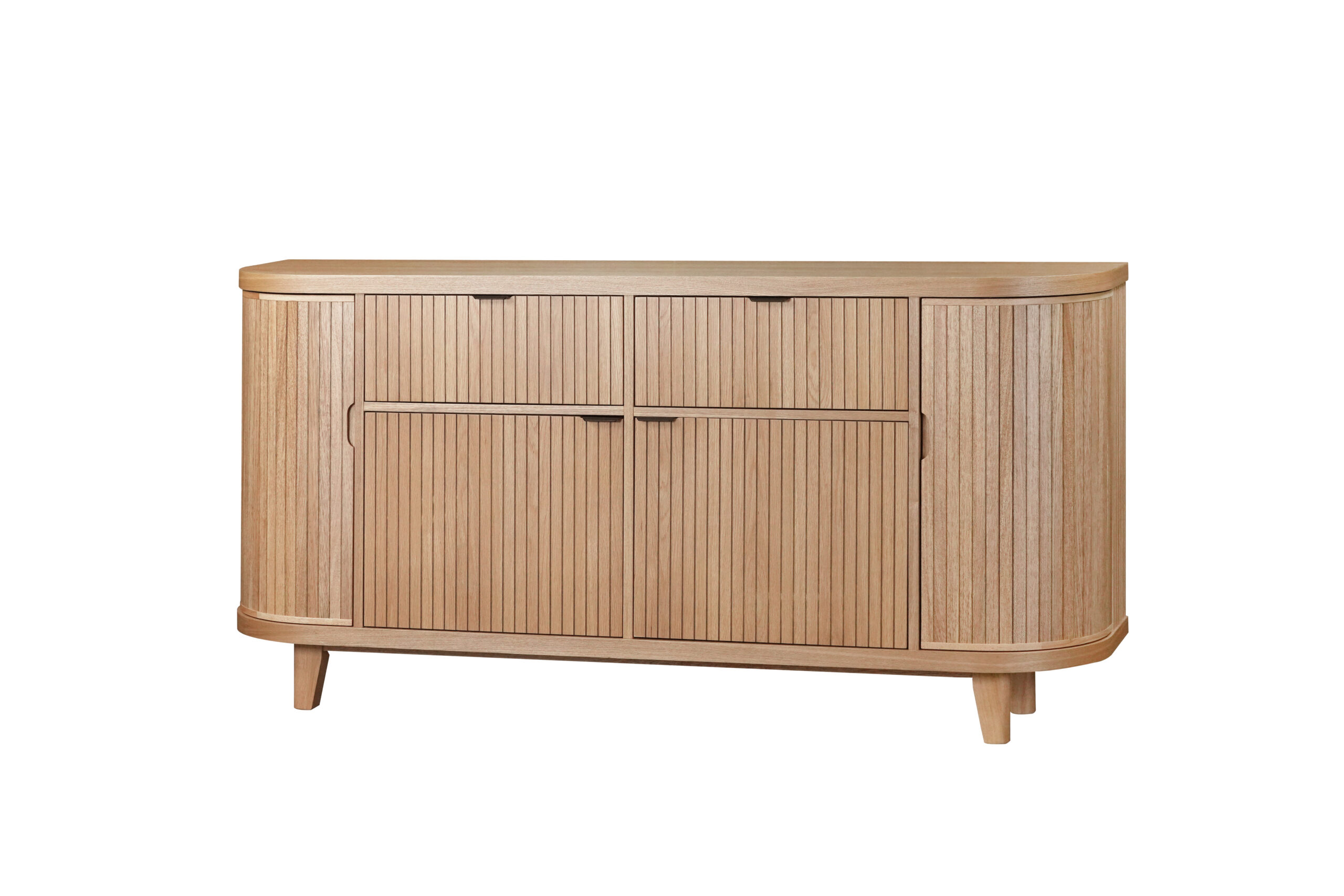 Introducing the Soraya natural 2 Drawer 4 Door Buffet in Oak Finish. With a unique curved edge design, this buffet adds a touch of modern elegance to any dining room.
