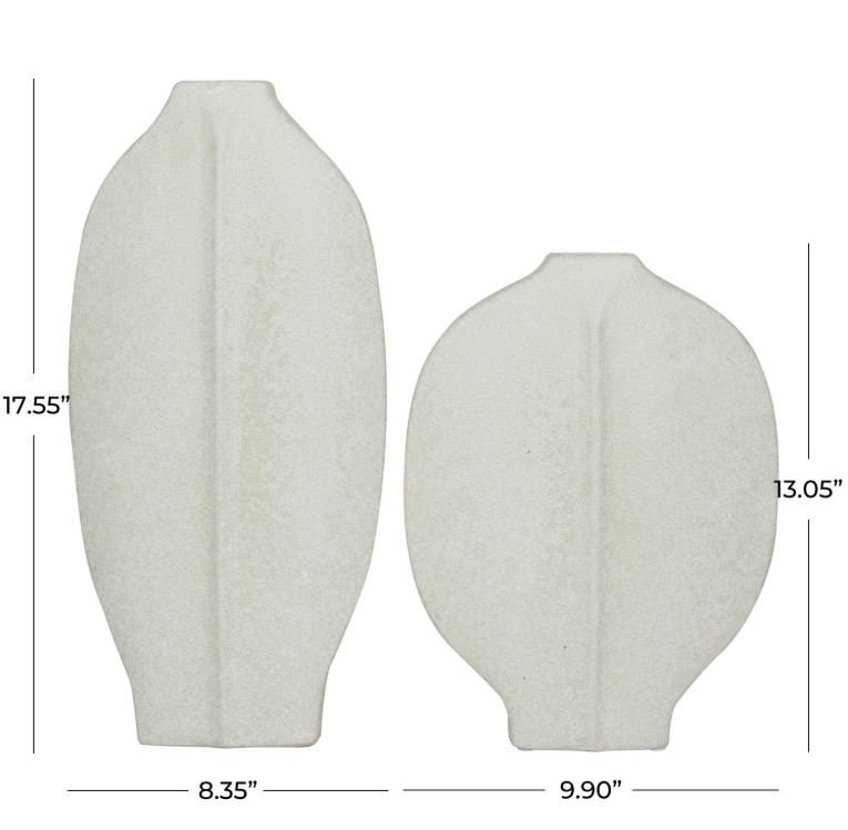 Each white ceramic vase measures 8.35L x 3.90W x 17.55H , 9.90L x 3.85W x 13.05H inches, and collectively weighs 8.44 lbs