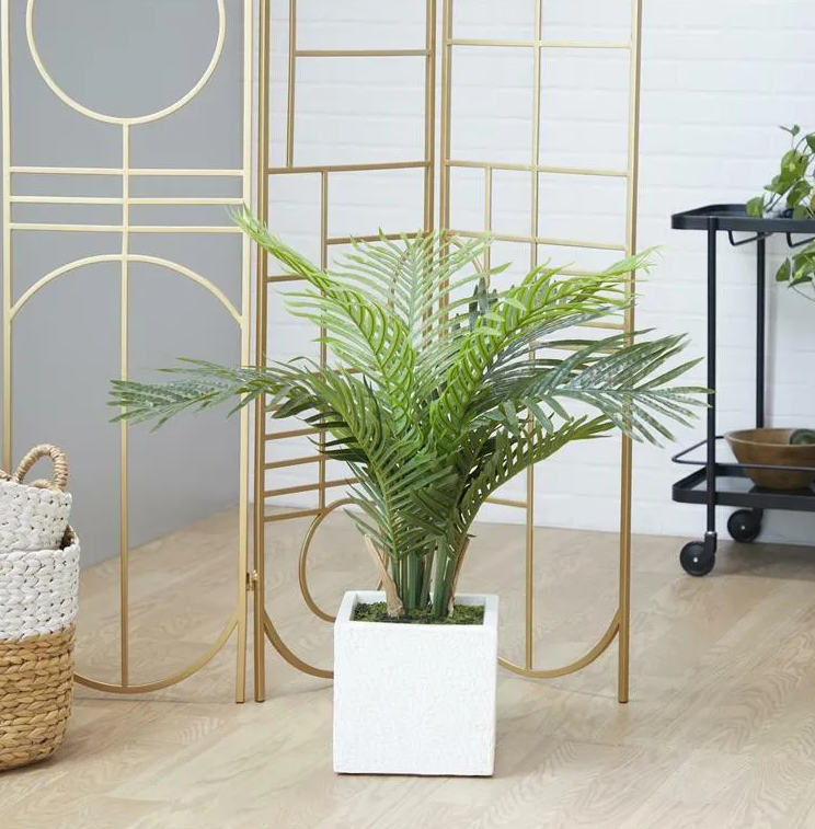 This potted artificial plant measures 28″L x 40″W x 33″H and weighs 16.28 lbs
