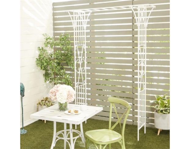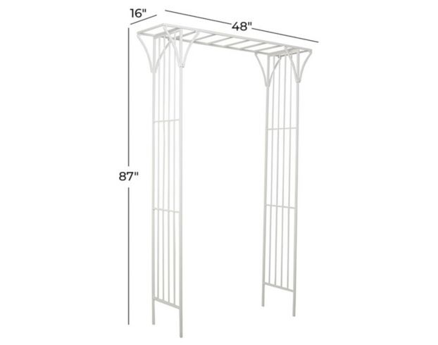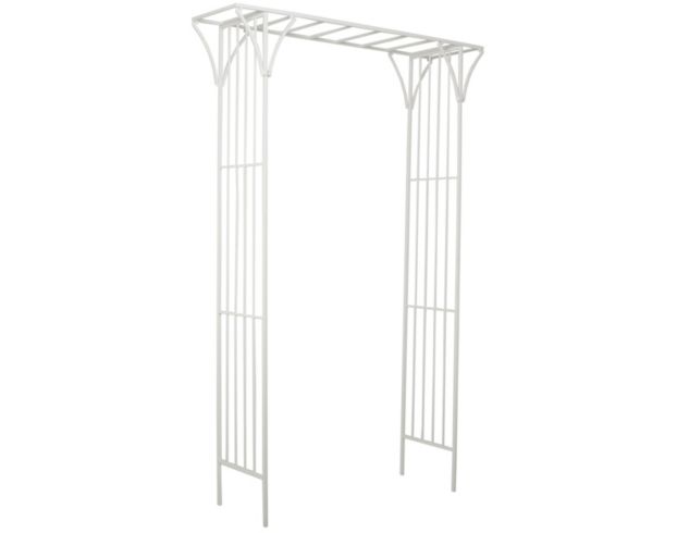 The contemporary style of this white metal garden arbor offers neutral elements and basic forms with a bold design. This piece is crafted with iron for a solid and durable form and has an ivory white finish. Avoid using abrasive cleaning pads or detergents; use a sponge with mild soap and warm water, then rinse with a garden hose. Iron structure is painted with a special coating to help protect it from the elements; iron may show signs of corrosion in salt air environments.