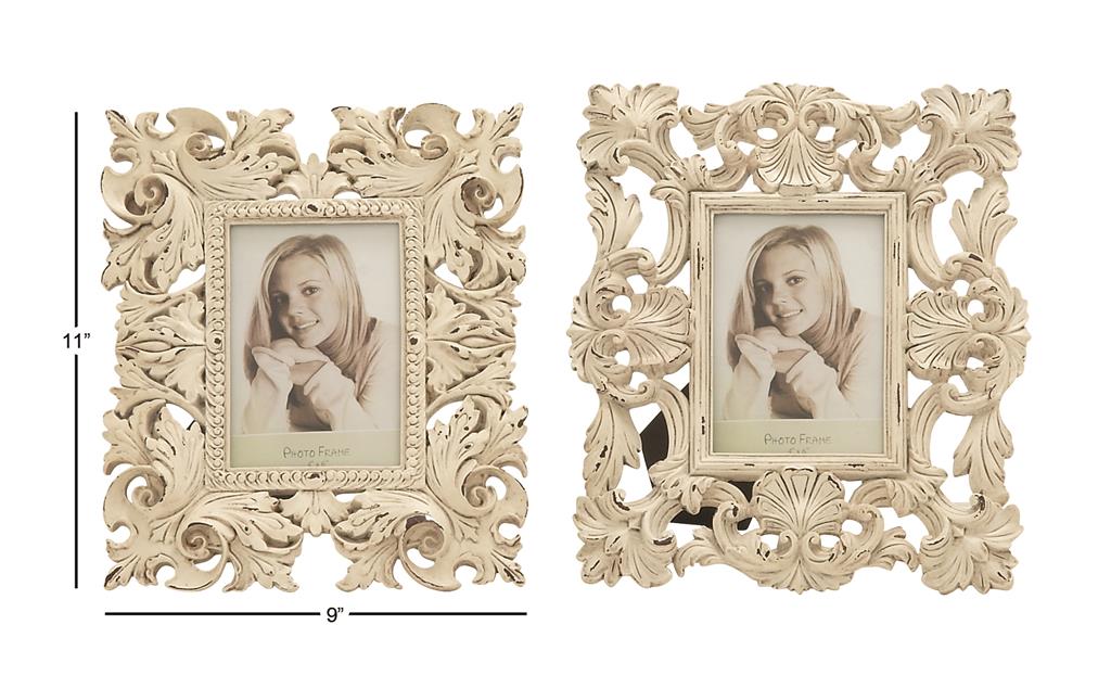 Elegant botanical design on polystone with chipped white finish lends the frames a vintage aesthetic