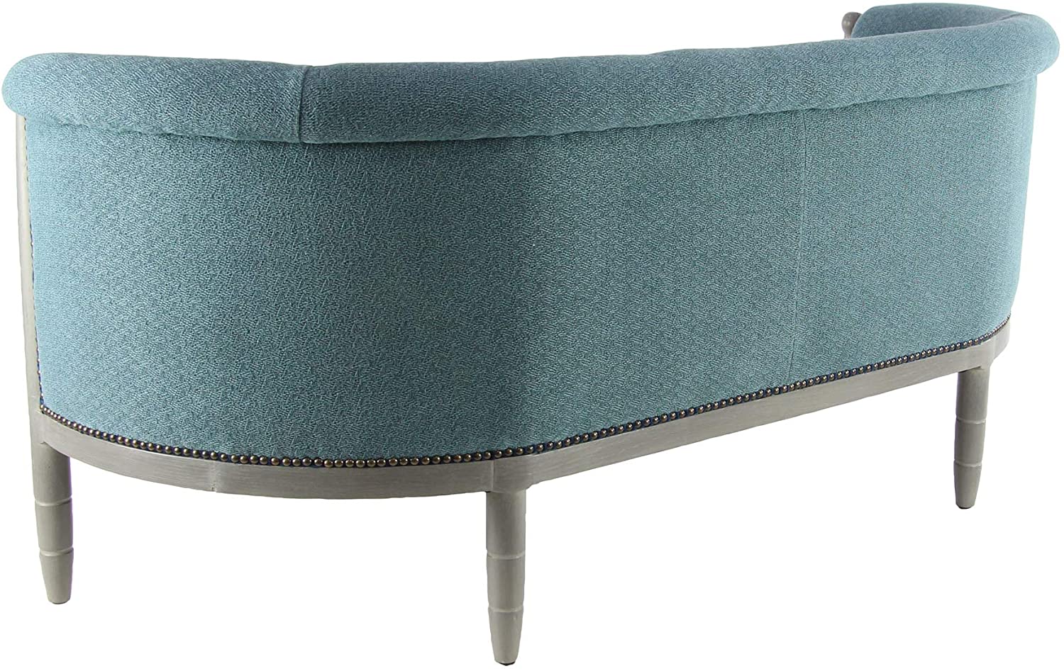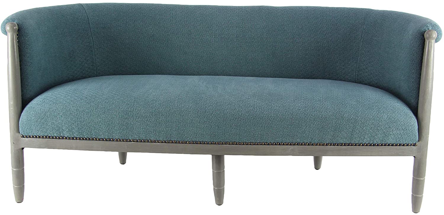 Modern sofa, crafted from birch wood and polyester, features a textured blue fabric upholstery, gray wooden frame and legs, designed with a cushioned backrest and seat, 5 wooden legs.