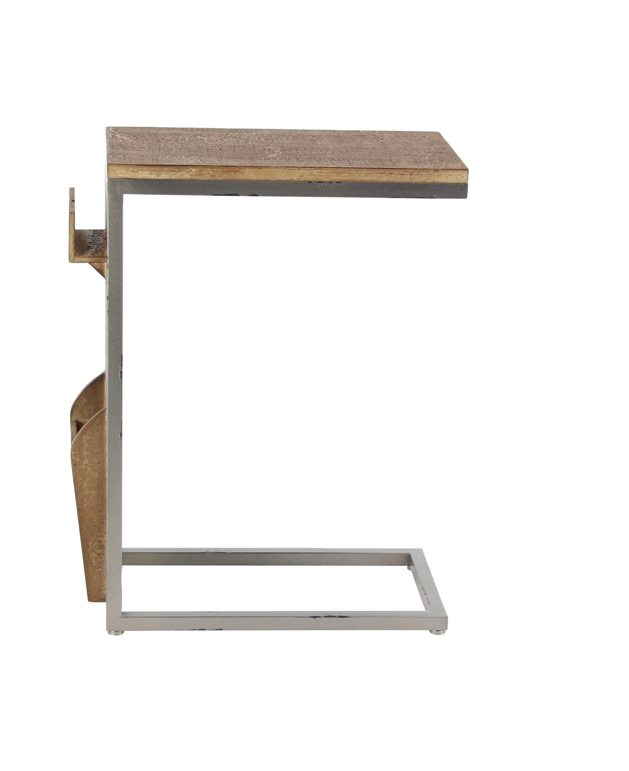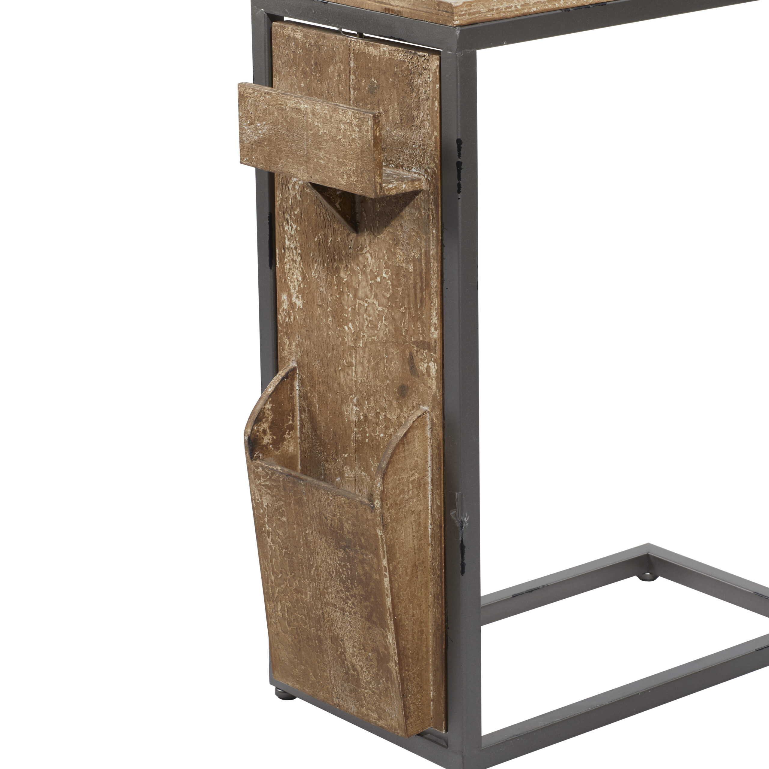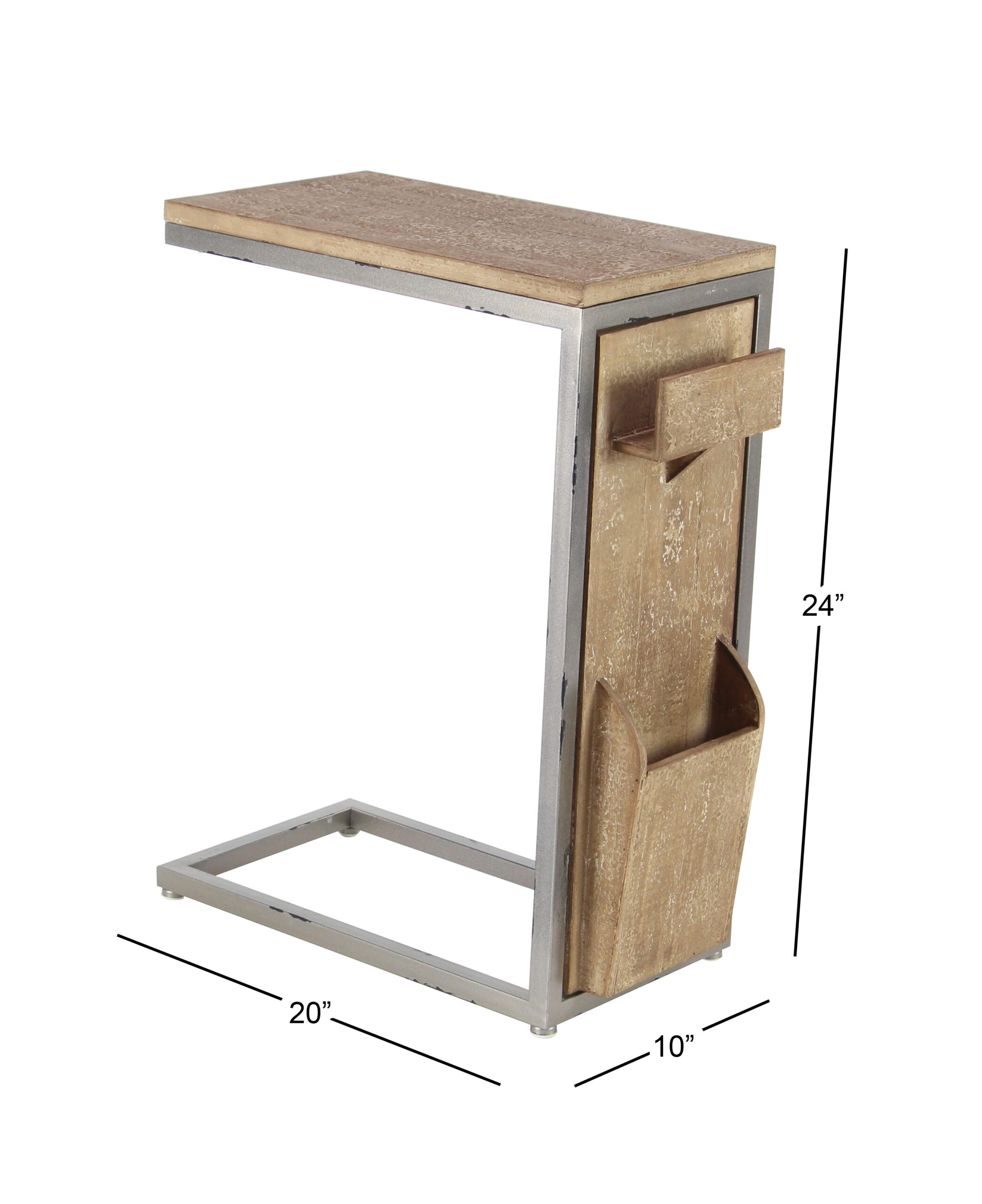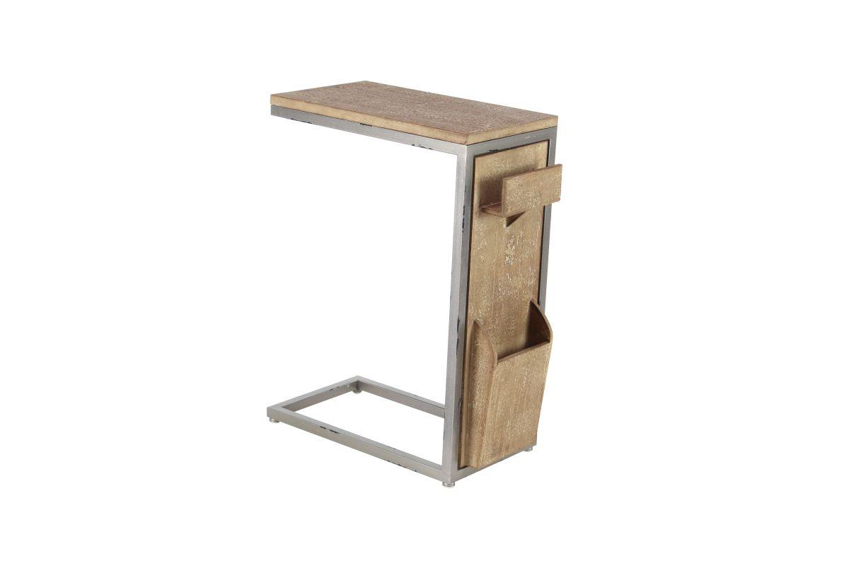 Spacious accent table with storage slots on side panel for magazine and trinkets, the slender C shape design allows you to tuck this table in any space. Features an industrial inspired design to make your space unique