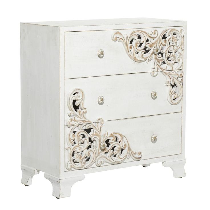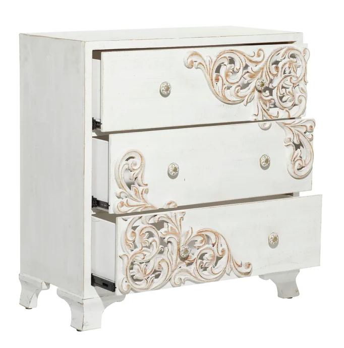 This 3-drawer accent chest transforms your modern or French country living spaces with its clean-lined silhouette and decorative open scrollwork. It’s made from solid pine wood in a distressed white finish, with light brown decals that add some contrast. This chest rests on bracket feet for a traditional edge to this design. Three drawers open to reveal ample space for seasonal clothes, linens, and other items.